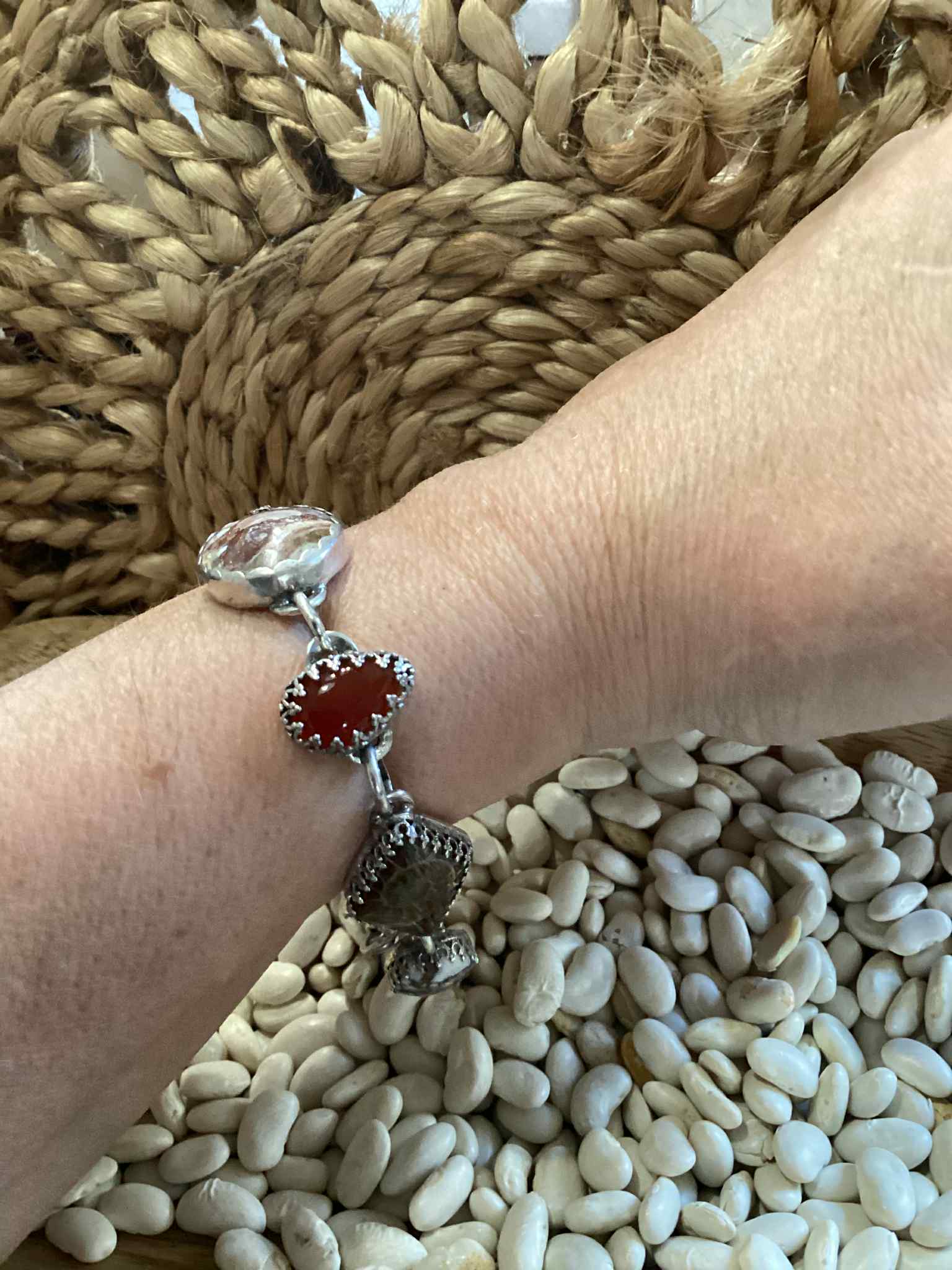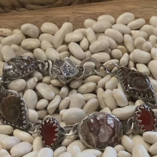 I designed and hand crafted this genuine sterling Silver, white horse, amber and ammonite bracelet. Everything on this piece is hand crafted. The clasp is hand crafted as well as the hammered hook that forms the closure There is a genuine sterling silver cast flower. It is stamped with my makers mark and stamped 925. Each link is hand forged. It measures 9 inches in length.