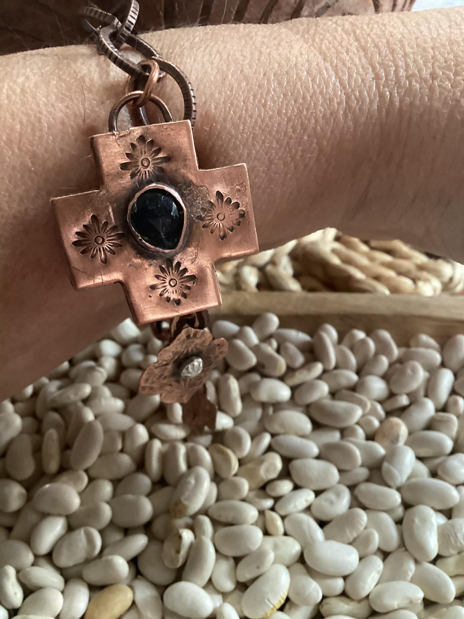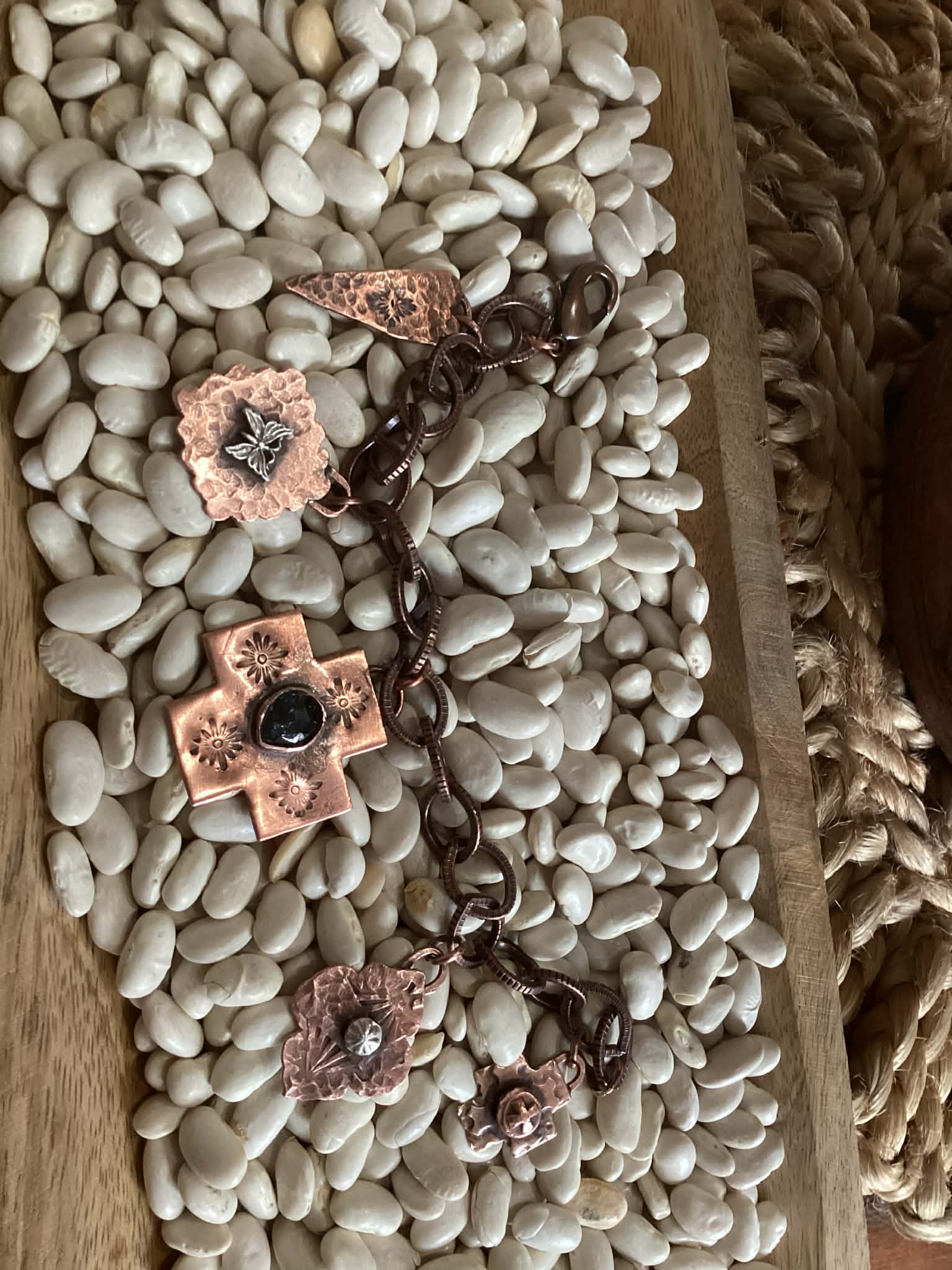 I designed and handcrafted this genuine copper and sapphire charm bracelet. Each piece is cut by hand and each charm is soldered on and hand forged. This bracelet comes signed. The silver on the charms is sterling silver. The whole bracelet is genuine copper. The gemstone is genuine also. It measures 9 inches in length. Where stacked or bold enough to be worn alone. The cross measures 1.25 inches x 1.25. It is hand stamped, as is the other charms. Also, it is hand hammered. It is then slightly oxidized as to help the designs and hammering pop!