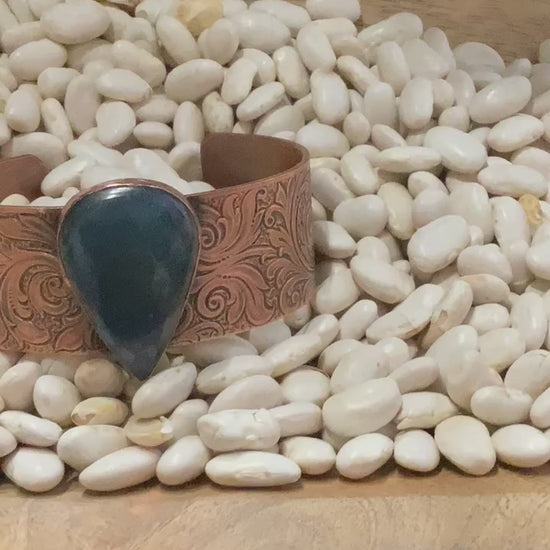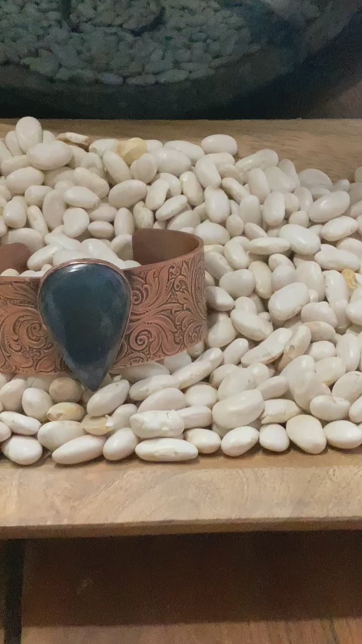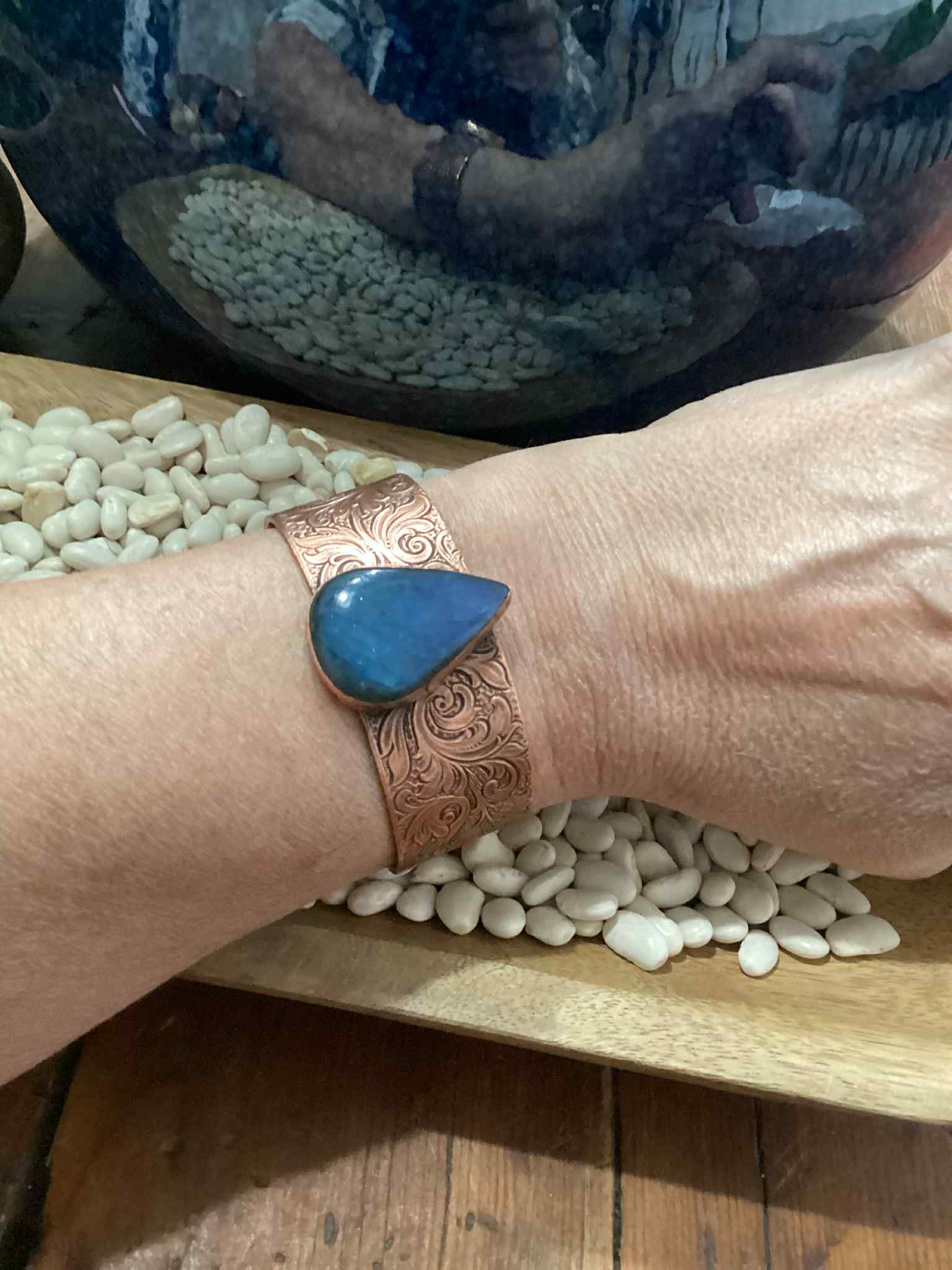I designed and hand crafted this genuine copper and labradorite cuff bracelet measures .6.5 inches. The cuff from side to side measures 2.25 inches. It is also stamped on the inside of the cuff with my makers mark. This bracelet is slightly oxidized and is buffed out to make the designs pop.