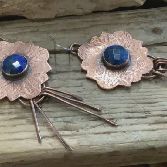 I designed and hand crafted these genuine sterling silver, copper and faceted lapis earrings. They are hand stamped with a dragonfly motif and vines. The back are hand stamped with my maker's mark. Each piece that hangs from the bottom of the earrings are hand hammered. The earring posts are sterling silver. They measure 3.25 inches long and 1.50 wide. They are slightly oxidized for that rustic look and feel. Then buffed out and the finish is a wax that seals that finish.