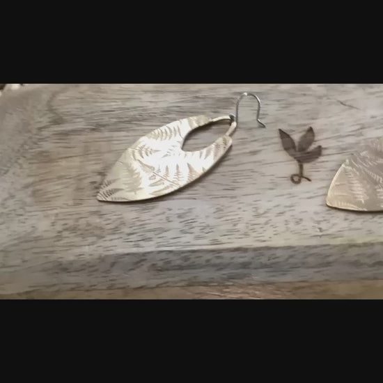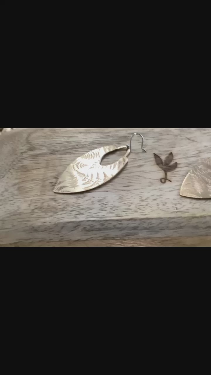 I designed and hand crafted these genuine sterling silver and brass earrings. They are hand stamped a fern design. The hooks are sterling silver and hand crafted. They measure 2 3/4 x 1 inches. They are slightly oxidized and buffed out and sealed with a jeweler's wax. The back of the earrings are stamped with my maker's mark.