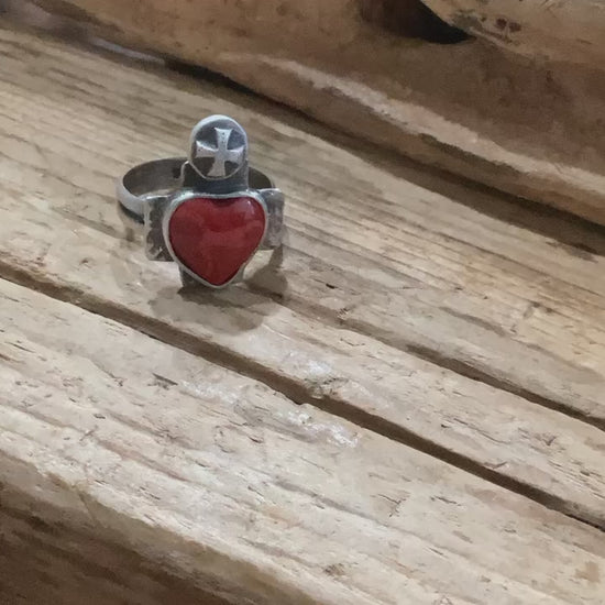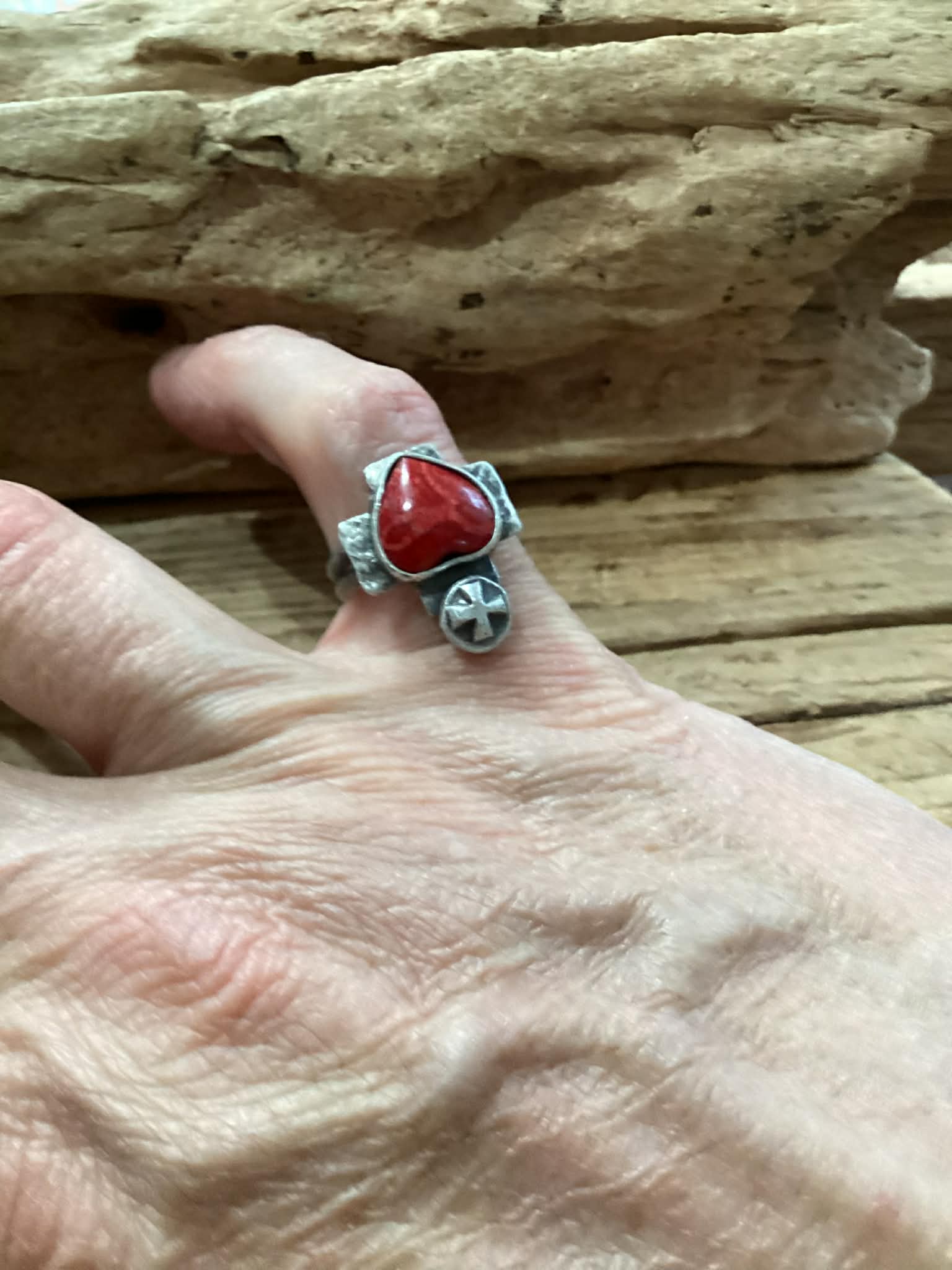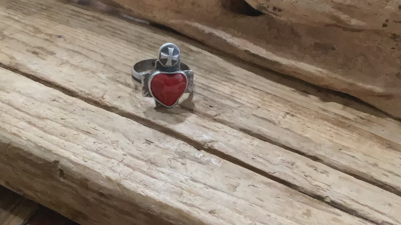 I designed and hand crafted this red coral and sterling silver ring. It is a size 7.5. The heart is genuine red coral. The cross is hand forged. The back of the ring is signed with my makers mark and 925. This ring was designed out of my love for Sante Fe New Mexico.