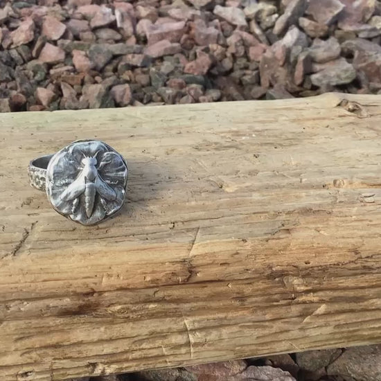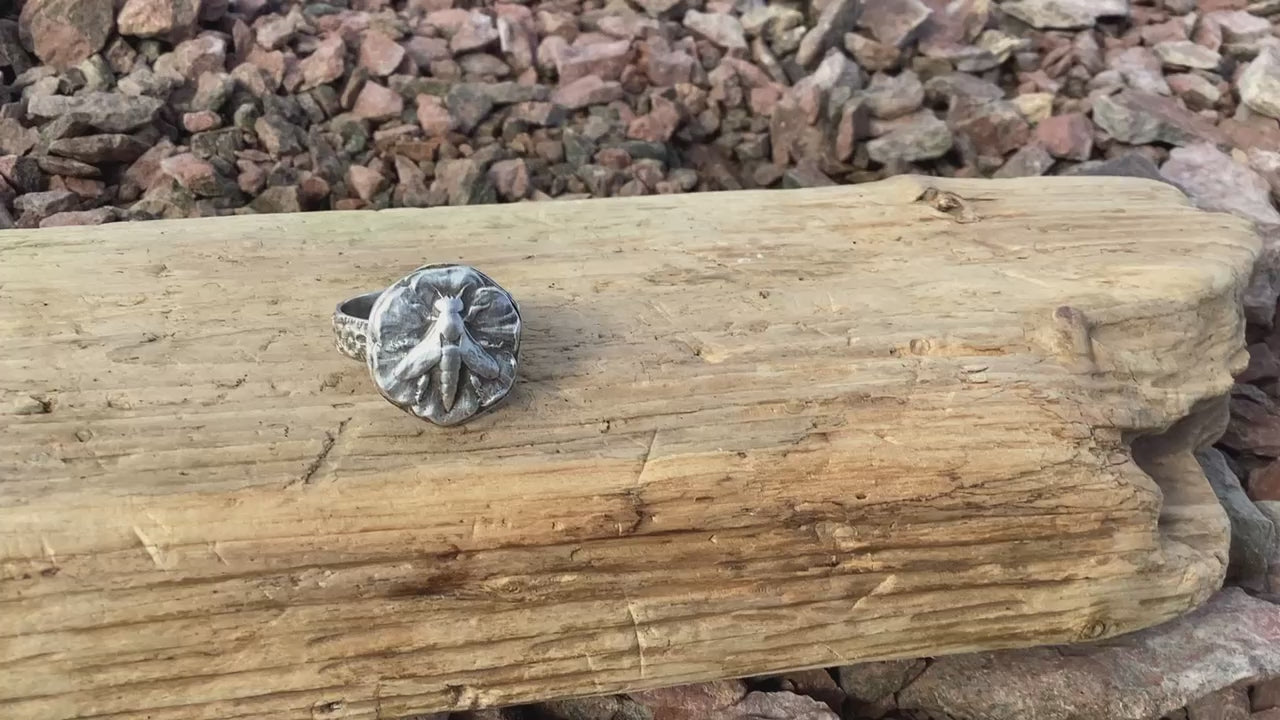 I designed and hand crafted this genuine sterling silver ring. I melted the sterling silver and then inserted the ball onto the antique die. I then pressed it to form the bee you see on the top of the ring. I then decided that the floral band would pair beautifully with the floral band. My inspiration for this ring came from the need to continue to mindful of the importance of the bee in our world. In making and designing this ring my hopes are that it brings awareness to each of us. This ring is sterling silver, as is the band. The inside of the ring is stamped 925 and is also stamped with my maker's mark. This ring is a size 9. The bee itself measures .75 inches round.
