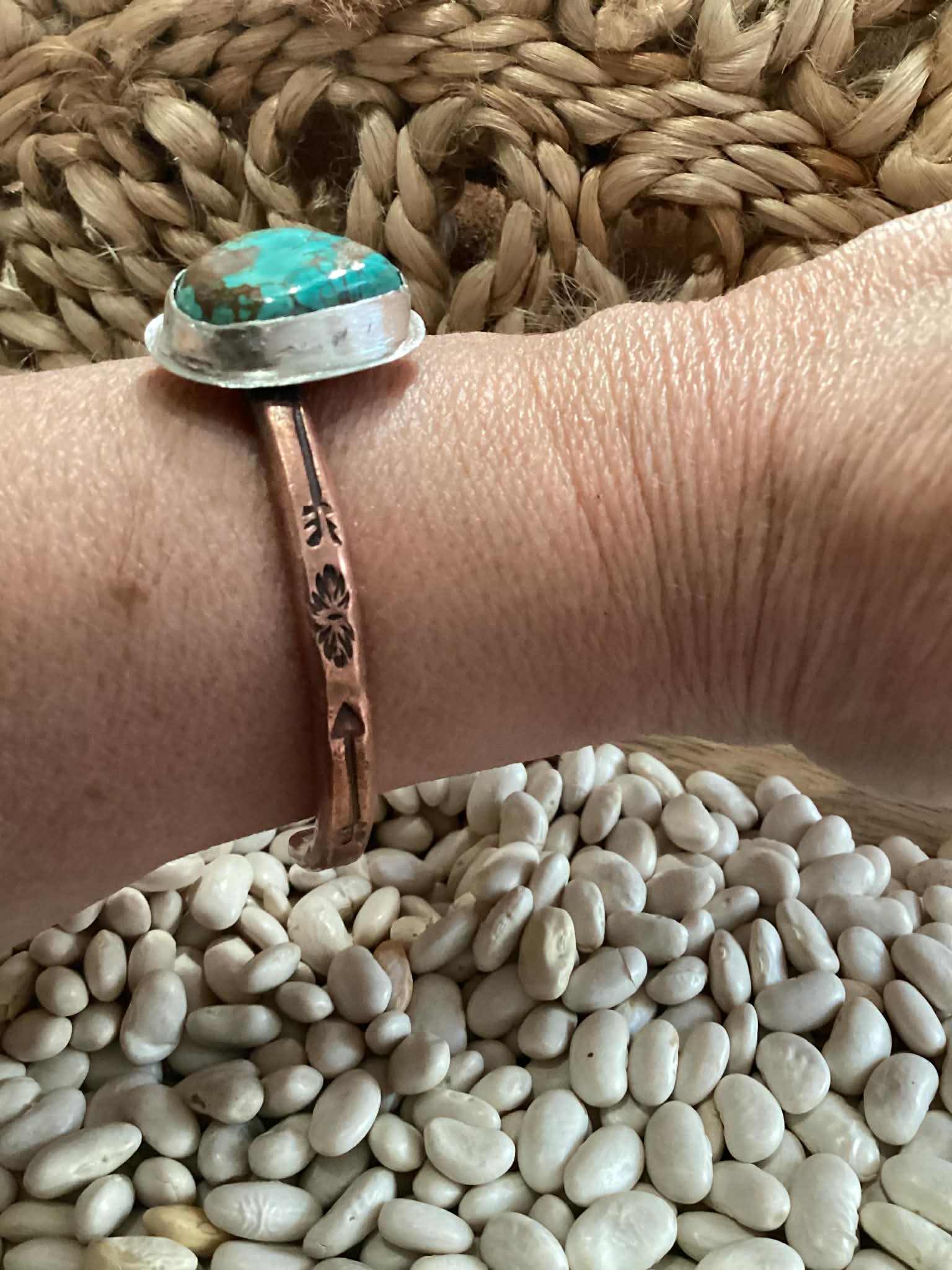 I designed and hand crafted this genuine sterling Silver, Copper and Turquoise Cuff Bracelet. The turquoise is set in a sterling silver bezel. It is stamped 925. It is also stamped with my makers mark on the inside of the cuff. It is hand stamped with a southwestern motif. The cuff is slightly oxidized to help the designs pop. The buffed out. This cuff measures 6.25 inches in length. The opening is 1.25 inches. From side to side, it measures 2.25 inches.